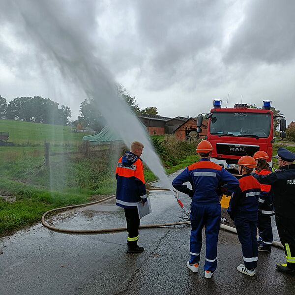 Auch für die Jugendflamme II mussten auf den Laufzetteln an den Stationen Unterschriften gesammelt werden. Hierfür mussten die Jugendlichen unter anderem ein Fahrzeug korrekt absichern, ein Standrohr setzen und einen improvisierten Wasserwerfer aufbauen. Dieser wurde unter Aufsicht der Wertungsrichter anschließend in Betrieb genommen.