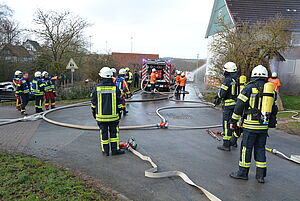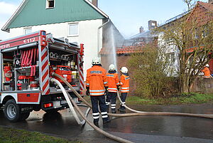 Als die Feuerwehren eintrafen, brannte der Dachstuhl des Schuppens in voller Ausdehnung und drohte auf das Wohnhaus überzugreifen. Es waren bereits Teile der Fassade, Fenster und Dach des unmittelbar angrenzenden Wohnhauses beschädigt.