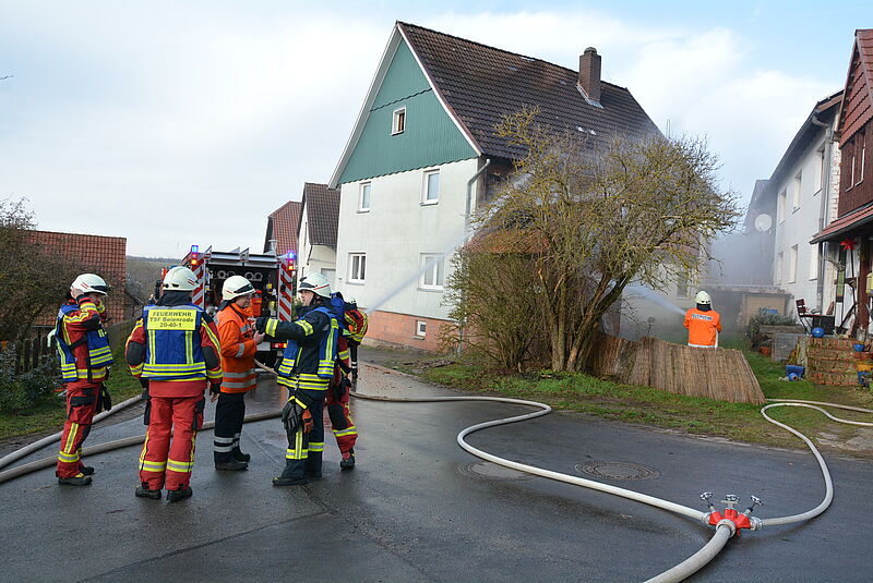 Eine Nachbarin hatte das Feuer bemerkt und die Eigentümer über den Brand eines am Wohnhaus angebauten Schuppen informiert. Die Familie, ein junges Paar mit 3 Kindern, konnten ihr Haus unverletzt verlassen.