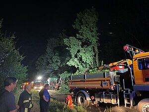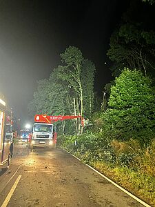 Durch den Sturm oder einer Windhose war eine Schneise durch umgestürzte Bäume entstanden. Während den Aufräumarbeiten waren laute "Knackgeräusche" in einer Baumgruppe zu hören. Daraufhin mussten aus Sicherheitsgründen die Arbeiten eingestellt werden.